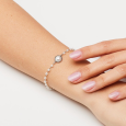 Řetízkový náramek s jemnými perlami a větší perlou jako dominantním prvkem působí něžně a elegantně. Minimalistický design mu dodává nadčasovost a snadno se kombinuje s různými styly.