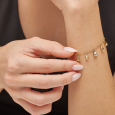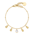 Náramek nese visící kapkové přívěsky ve zlaté barvě a jeden křišťálový akcent, které dodávají šperku lehký lesk a hravost. Náramek je navržen pro ženy, které si vybírají doplněk s elegancí a moderním nádechem – ideální pro denní i výjimečnou příležitost.