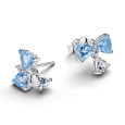 Stříbrné náušnice NETFLIX X PANDORA Bridgerton zdobí motiv mašle s křišťály v jemném modrém odstínu, doplněný čirými zirkony uprostřed.