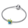 Stříbrný DISNEY x PANDORA korálek Mimozemšťan z Toy Story, který je zdobený modrou a třpytivou zelenou glarurou.