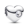 Stříbrný PANDORA korálek srdce se zirkonem čiré barvy - barva často spojovaná s měsícem DUBEN. Druhá, hladká strana je vhodná ke gravírování.