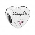 Stříbrný PANDORA korálek ve tvaru srdíčka s nápisem "Dcera" a růžovým zirkonem. Připomínejte si stále lásku vaší dcery.
