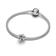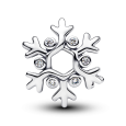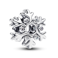 PANDORA stříbrný korálek zobrazuje otevřenou sněhovou vločku zdobenou zirkony čiré barvy, které odrážejí jemné světlo.