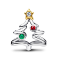 PANDORA korálek zobrazuje otevřený stromek zdobený zirkony a křišťály v červené a zelené barvě, vrchol stromku zdobí pozlacená hvězda s kamínkem.
