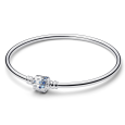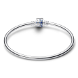 Stříbrný náramek PANDORA má pevný minimalistický tvar a válečkové zapínání zdobené modrými křišťály, čirými zirkony a modrými zirkony.