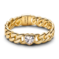 Dámský pozlacený prsten PANDORA z kolekce Timeless s výrazným designem, který doplňuje jeden čirý krychlový zirkon ve tvaru srdce osazený v hladkém lůžku. Propojené leštěné články vytvářejí moderní a odvážnou linii, zatímco minimalistické zpracování nechává vyniknout symbolický tvar kamene.