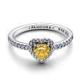 PANDORA stříbrný prsten se srdíčkovým zirkonem žluté barvy a menšími čirými zirkony.