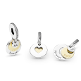 Stříbrný PANDORA korálek se skládá ze tří samostatně visících prvků, které spolu vytvářejí dojímavé vyznání. Souprava obsahuje dva stříbrné disky, z nichž jeden má výřez ve tvaru srdce a nese gravírovaný nápis Forever. Uprostřed se nachází disk vyrobený ze 14karátového žlutého zlata s nápisem You, který doplňuje malý stříbrný kroužek s nápisem Me.