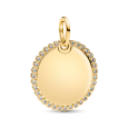 PANDORA pozlacený gravírovatelný kulatý přívěsek se zirkony čiré barvy.