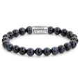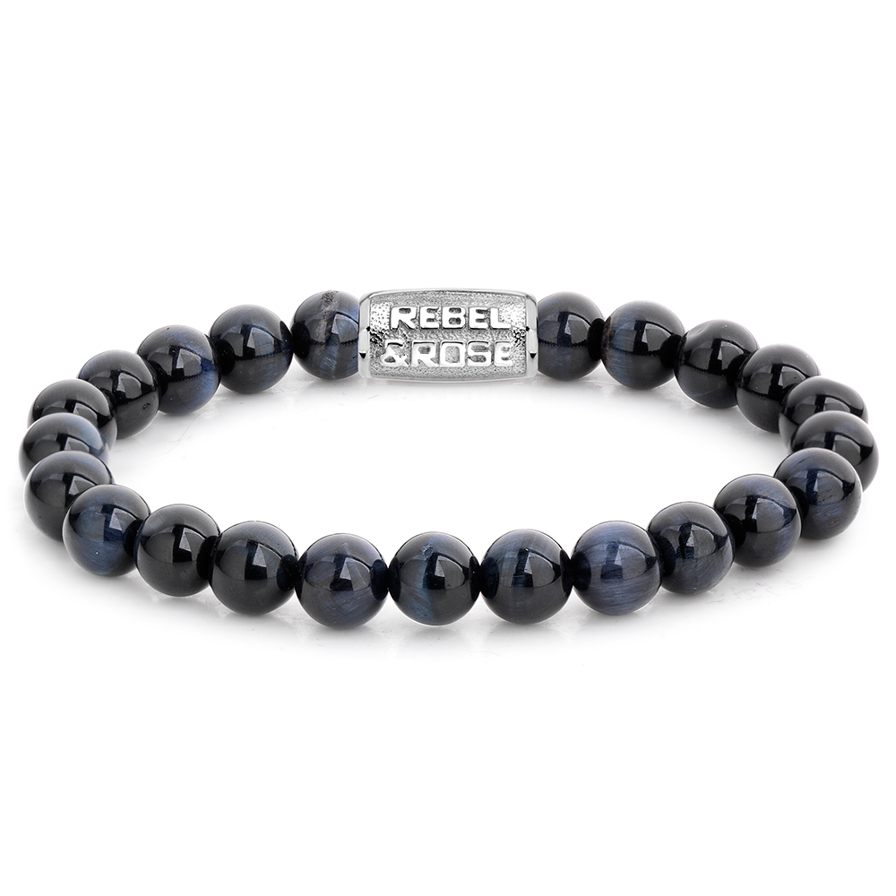 REBEL & ROSE pánský náramek s modrým tygřím okem a ocelovou částí s logem značky.