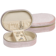 Elegantní šperkovnice v oválném tvaru je potažena měkkým sametovým materiálem v jemně růžovém odstínu a uzavírá se kovovým zipem.
