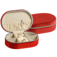 Elegantní šperkovnice v oválném tvaru je potažena měkkým sametovým materiálem v červeném odstínu a uzavírá se kovovým zipem.