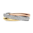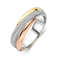 Dámský stříbrný prsten TI SENTO se žlutým a růžovým pozlacením vyniká elegantní kombinací tónů – povrch obroučky je jemně tvarovaná a vsazená pavé řada čirých zirkonů, které zachycují světlo a přinášejí šperku jemnou jiskru.