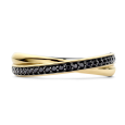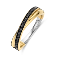 Dámský prsten TI SENTO zaujme elegantním dvoubarevným provedením. Hladká linie žlutého kovu se prolíná se stříbrným ramenem prstenu a vytváří jemný, propletený efekt. Přední část zdobí řada drobných černých zirkonů, které dodávají šperku výrazný kontrast a moderní charakter.