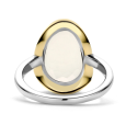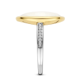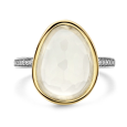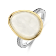 Dámský stříbrný prsten TI SENTO se žlutým pozlacením vyniká výrazným kamenným prvkem – velký mléčně-bílý křišťál obklopený řadou čirých zirkonů, které jemně zachycují světlo a dodávají šperku plynulý lesk.