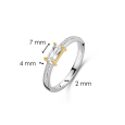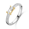 Prsten TI SENTO je vyroben ze stříbra se žlutým pozlacením a dominuje mu podlouhlý čirý zirkon v pozlaceném osazení, který doplňuje jemné pavé z čirých zirkonů na obroučce pro souvislý, elegantní lesk.