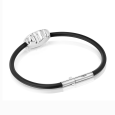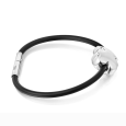 Kontrast stříbrného detailu a černého pásku vytváří výrazný, ale stále jednoduchý šperk s jasnou linií a praktickým ocelovým zapínáním na sponu.