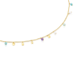 TOUS dámský náhrdelník z kolekce Cool Joy je vyroben ze stříbra s 18karátovým pozlacením a zdoben drobnými kamínky v rozmanitých pastelových odstínech. Na jemném řetízku jsou nepravidelně rozmístěny malé drahokamy, polodrahokamy (ametyst, aventurín, magnezit, rodochrozit a perly) a miniaturní přívěsky v podobě srdíček, hvězdiček a ikonických medvídků TOUS, které dodávají náhrdelníku hravý a veselý.